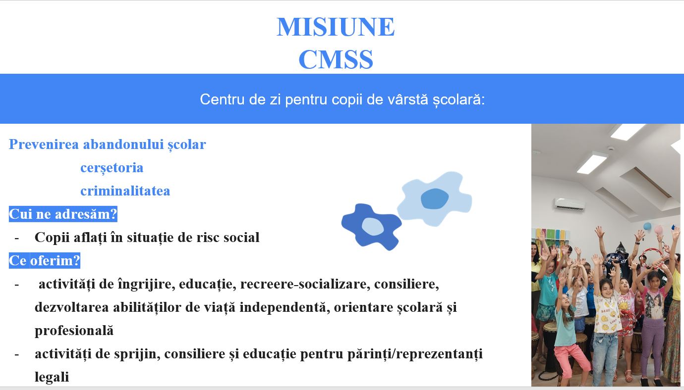 - S-a realizat o prezentare a Centrului Multifuncțional de Servicii Sociale din structura Direcției de Asistență Socială Sibiu- centru de zi pentru copii de vârstă școlară și persoane vârstnice. Au fost prezentate serviciile sociale și activitățile educativ-recreative oferite beneficiarilor în cadrului.