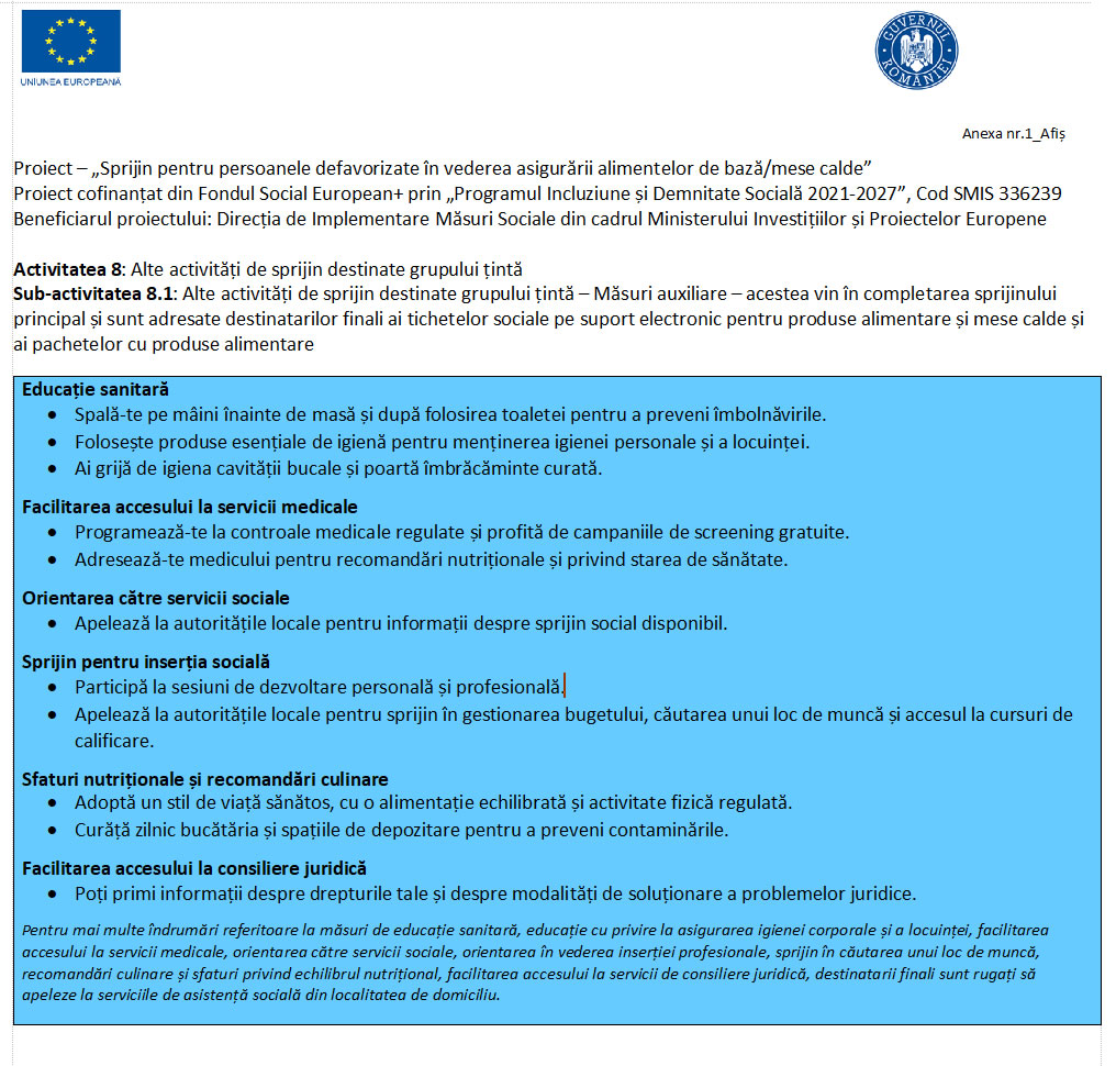 Afiș cu informațiile privind măsurile auxiliare pentru proiectul „Sprijin pentru persoanele defavorizate”